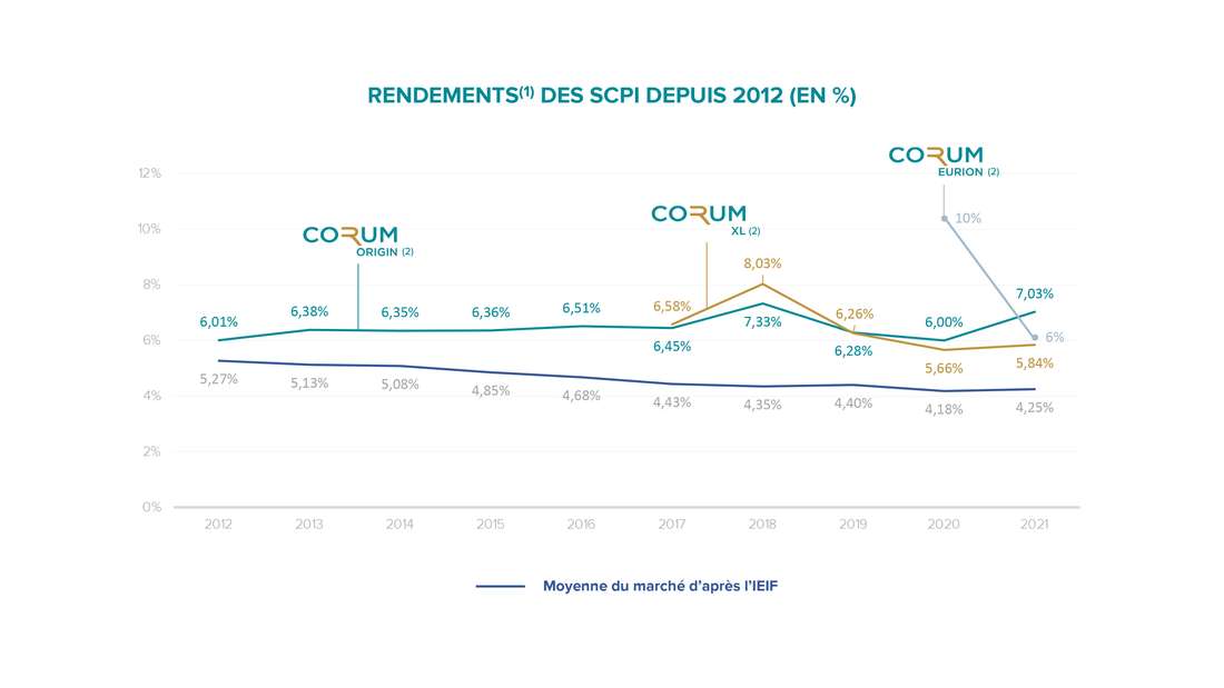 (1) Rendement ou taux de distribution, défini comme le dividende brut, avant prélèvements sociaux et fiscaux, français et étrangers (payés par le fonds pour le compte de l’associé) versé au titre de l’année n (y compris les acomptes exceptionnels et quote-part de plus-values distribuées, 1,25 % sur CORUM Origin et 0,10 % pour CORUM XL en 2021) divisé par le prix de souscription au 1er janvier de l’année N de la part. Cet indicateur permet de mesurer la performance financière annuelle de CORUM Origin, CORUM XL et CORUM Eurion. Taux de rentabilité interne (TRI) : mesure la rentabilité de l’investissement sur une période donnée et tient compte de l’évolution de la valeur de part et des dividendes distribués sur la période, ainsi que des frais de souscription et de gestion supportés par l’investisseur. A savoir : 6,60 % sur 10 ans pour CORUM Origin, un objectif de 10 % sur 10 ans pour CORUM XL et un objectif de 4,5 % sur 10 ans pour CORUM Eurion.